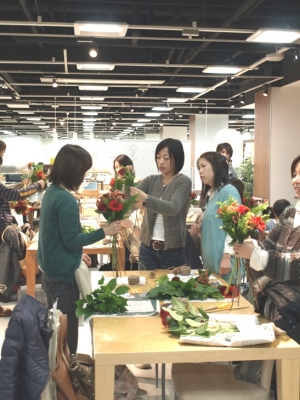 | ショールームに出張してのブーケ作り教室。皆さん真剣な表情! |