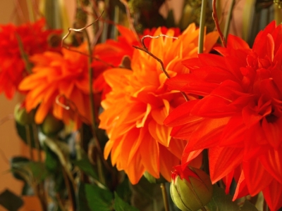カフェを飾るダリアのアレンジ。本物のようですが造花です。