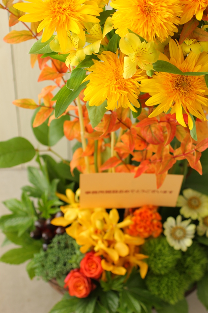 紅葉したヒペリカムをあわせてヒマワリを秋顔に。